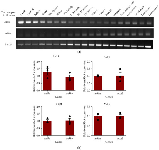 To determine the temporal expression pattern of ankha and ankhb, we performed RT-PCR targeting 19 different developmental time points. Total mRNA was extracted from zebrafish, including samples at embryonic and larval developmental stages (2-cell (0.75 h post-fertilization (hpf), 256-cell (2.5 hpf), sphere (4.0 hpf), dome (4.3 hpf), 50% epiboly (5.3 hpf), shield (6.0 hpf), 75% epiboly (8.0 hpf), 5–9-somite (11.0 hpf), 14–19-somite (16.0 hpf), 26+-somite (22.0 hpf), prim-5 (25.0 hpf), prim-15 (32.0 hpf), prim-25 (35 hpf), 2-dpf, 3-dpf, 4-dpf, 5-dpf, 6-dpf and larval day 7 stages). A pool of 30 embryos or larvae was collected for each stage, and mRNA extraction was performed using TRIzol reagent and chloroform (Thermo Fisher Scientific, Mississauga, ON, Canada). The isolated RNA was reverse-transcribed into cDNA using the High-Capacity cDNA Reverse Transcription kit (Thermo Fisher Scientific, Mississauga, ON, Canada), following the manufacturer’s instructions. RT-PCR was performed under the following reaction conditions: 500 nanomolar (nM) forward and reverse primers, 25 μL of DreamTaq Green PCR Master Mix (Thermo Fisher Scientific, Mississauga, ON, Canada), and 1 μL of cDNA template. The reactions were performed using a C1000 Touch Thermal Cycler (Bio-rad, Hercules, CA, USA) for 35 cycles. The samples were visualized using a 2% agarose gel (1× TAE) containing RedSafe, and the gels were imaged using the ChemiDoc Touch Imaging System. Primer sets for ankha and ankhb were utilized in the RT-PCR analysis (Table 1). lsm12b served as a loading control due to its consistent expression pattern compared to that of most other housekeeping genes [25]. All primers were optimized, and the desired amplicon was sent for sequencing for further confirmation.