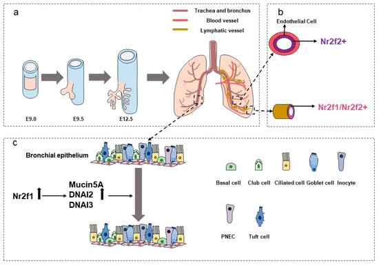 Roles of the NR2F family in the lung development. (a) An illustration of lung development. (b) NR2F1/2 were identified as markers of angiogenesis and lymphangiogenesis in lung. (c) Up-regulation of Nr2f1 increases the number of lung bronchial epithelial ciliated cells through cilia-related genes such as DNAI2.