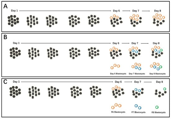 Schematic representation of blastocyst formation dynamics and blastocyst collection methods. (A,B) Day 6, 7, or 8 blastocysts were obtained using a traditional blastocyst collection method. (C) Newly formed blastocysts on day 6 of culture were collected (F6 blastocysts, orange color). The rest of the embryos were left to culture further, and newly formed blastocysts on day 7 of culture were collected (F7 blastocysts, blue color). Similarly, newly formed F8 blastocysts were collected on day 8 of culture (green color). Usually, blastocysts obtained on day 7 or 8 are mixed blastocysts (B), e.g., Day 7 blastocysts included F7 (newly formed on day 7 of culture) and old F6 (blastocysts formed on day 6 of culture but were collected on day 7) blastocysts; Day 8 blastocysts included F8 (newly formed on day 8 of culture), old F7 (blastocysts formed on day 7 of culture but were collected on day 8), old F6 (blastocysts formed on day 6 of culture but were collected on day 8) blastocysts.