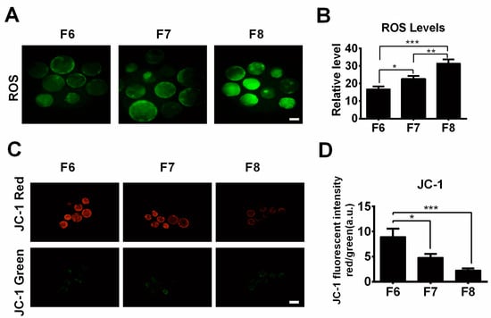 The impact of delayed blastocyst formation on ROS formation and mitochondrial membrane potential. (A) ROS staining using H2DCFDA in F6, F7, and F8 blastocysts. (B) The relative green fluorescence intensity of ROS was measured in F6 (n = 30), F7 (n = 30), and F8 (n = 28) blastocysts. (C) JC-1 staining (J-aggregates, red; J-monomers, green) in F6, F7, and F8 blastocysts. (D) The mitochondrial membrane potential was analyzed as the ratio of red to green fluorescence in F6 (n = 27), F7 (n = 24), and F8 (n = 20) blastocysts. * p < 0.05, ** p < 0.01, *** p < 0.001. Scale bars represent 100 μm in (A,C).