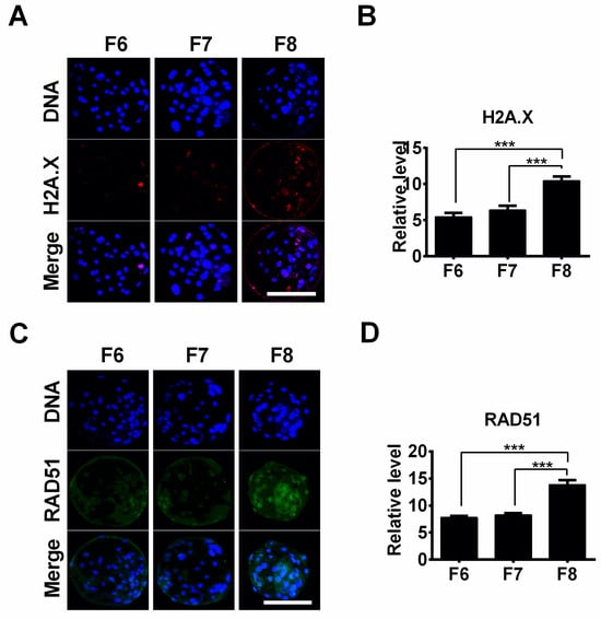 To investigate the influence of delayed blastocyst formation on DNA damage, the levels of the DNA damage response protein H2A.X (Ser139) were determined. The DNA damage levels in the F8 blastocyst group were significantly higher than those in the F6 and F7 groups (Figure 3A,B). However, there were no differences between the F6 and F7 blastocyst groups (Figure 3B). We also evaluated the expression levels of the DNA repair protein RAD51 by means of immunostaining and laser scanning confocal microscopy. We found that the F8 blastocyst group showed a significantly higher expression level of RAD51 than the F6 and F7 blastocyst groups (Figure 3C,D).