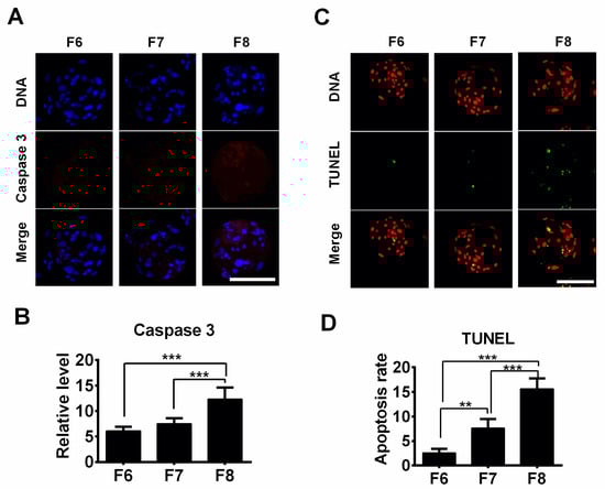 Finally, we investigated apoptotic incidents in the porcine F6, F7, and F8 blastocysts. Although there was no difference in caspase 3 protein levels between the F6 and F7 blastocyst groups, caspase 3 protein levels exhibited a significant increase in the F8 blastocyst group compared to the F6 and F7 blastocyst groups (Figure 4A,B). The apoptosis rates (TUNEL-positive signals) sharply increased across the groups in the order F6 < F7 < F8 (Figure 4C,D). Taken together, these findings suggest that delayed blastocyst formation leads to increased ROS formation and apoptosis-related events.