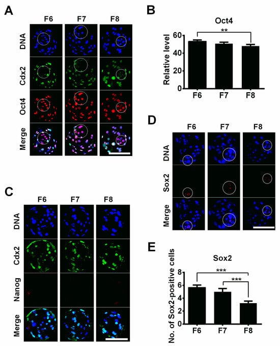 The influence of delayed blastocyst formation on pluripotent factors. (A) The expression patterns of Oct4 and Cdx2 were investigated in porcine F6, F7, and F8 blastocysts. (B) Quantification of Oct4 levels in porcine blastocysts (F6, n = 18; F7, n = 18; F8, n = 16). (C) The expressions of Cdx2 and Nanog were assessed in porcine blastocysts. (D) The expression pattern of Sox2 was estimated in blastocysts. (E) The numbers of Sox2-positive cells were estimated in blastocysts (F6, n = 25; F7, n = 24; F8, n = 22). ** p < 0.01, *** p < 0.001. Scale bars represent 100 μm in (A,C,D).