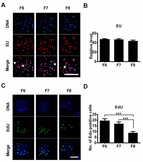To investigate RNA transcription expression in porcine blastocysts, F6, F7, and F8 blastocysts were treated with EU for 1 h. After fixation, permeabilization, and Click-iT detection, the samples were mounted and examined under a laser scanning confocal microscope. EU-positive staining signals were only co-localized in interphase cells and were not observed in M-phase cells (Figure 6A, white arrows), as described in porcine fetal fibroblast cells [16]. There was no difference in nascent RNA synthesis among these three blastocyst groups (Figure 6B), indicating that a delay in blastocyst formation did not influence RNA transcription. Next, we examined the influence of delayed blastocyst formation on DNA replication using 5-ethynyl-2’-deoxyuridine (EdU) staining. Proliferative cells (S phase) were labeled with EdU (green), and all nuclei were stained with DAPI (blue) (Figure 6C). We observed that the numbers of EdU-positive cells were significantly lower in the F8 blastocyst group than in the F6 and F7 groups (Figure 6C,D). The EdU-positive cell numbers in the F6 blastocyst group were higher than those in the F7 group, but this difference was not significant (Figure 6D). Therefore, these results suggest that delayed blastocyst formation leads to a decrease in the DNA replication level but does not influence RNA synthesis.
