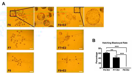The influence of delayed blastocyst formation on blastocyst hatching. (A) Images of blastocyst morphology. (B) Hatching rates of blastocysts for the F6 + E2 (n = 72), F7 + E2 (n = 51), and F8 + E2 (n = 30) groups. ** p < 0.01, *** p < 0.001. The scale bar represents 300 μm in A.