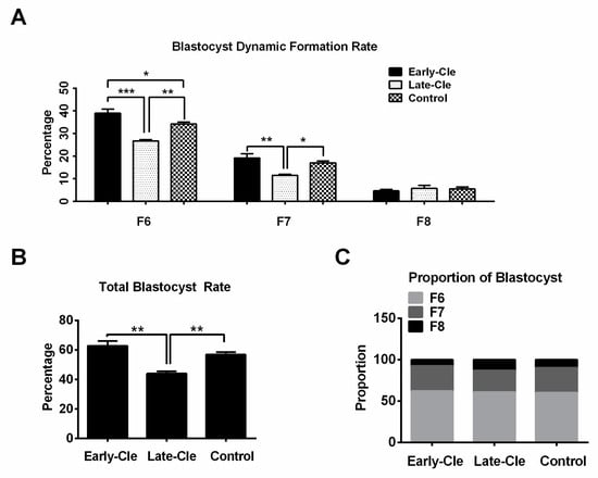 The influence of early and late cleavage on delayed blastocyst formation. (A) The dynamic formation rates of blastocysts derived from early-cleavage, late-cleavage, and control groups. (B) The total blastocyst formation (F6 + F7 + F8) rates. (C) The proportions of F6, F7, and F8 blastocysts in the total blastocyst group (F6 + F7 + F8). In total, 151, 149, and 146 cleaved embryos derived from early-cleavage embryos, late-cleavage embryos, and a control group were used for evaluation. Early-Cle and Late-Cle indicate the early-cleavage and late-cleavage embryo groups. * p < 0.05, ** p < 0.01, *** p < 0.001.