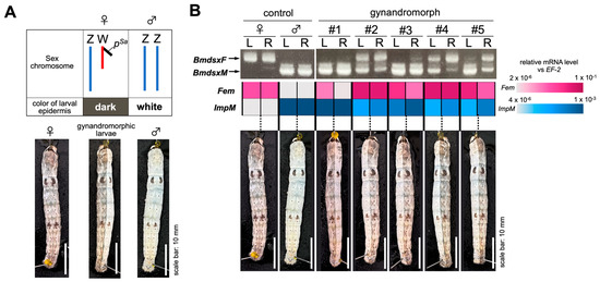 The silkworm strain m042 carrying the mo (hereditary mosaic) mutation, females of which produce mosaic and gynandromorphic offspring at high rates (Figure S1) [52,53], was provided by the Silkworm Stock Center of Kyushu University (Fukuoka, Japan). The W chromosome of this line carries a chromosome fragment from chromosome 2 containing the pSa mutation, which changes the color of the larval epidermis from white to dark, allowing gynandromorphic larvae to be distinguished visually according to the color of the larval epidermis (Figure 1A). The standard silkworm strain p50T was also provided by the Silkworm Stock Center of Kyushu University. Gynandromorphic animals used in this study were obtained from eggs produced by crosses between m042 females and p50T males. Non-gynandromorphic control animals with the same genetic background as the gynandromorphic animals were obtained from eggs produced by crosses between p50T females and m042 females. The silkworm larvae were reared under standard conditions, as described previously [54].
