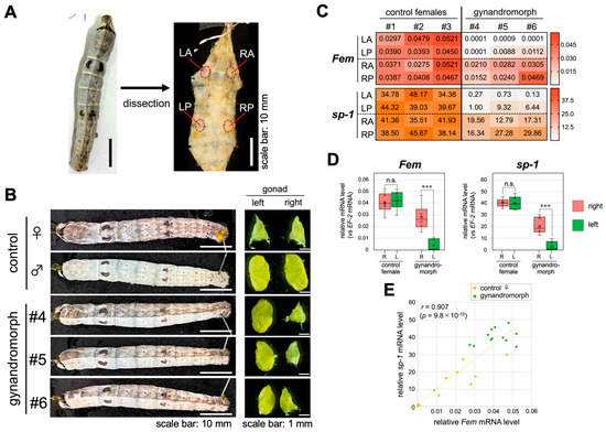 To verify the gynandromorphic status of the fat body, we quantitatively compared the expression level of the W-linked gene Fem between different areas of the fat body obtained from gynandromorphic day 3 fifth instar larvae. The total RNA was extracted from four different areas of the fat body (LA, left anterior; LP, left posterior; RA, right anterior; and RP, right posterior) and examined through RT-qPCR (Figure 2A). Gynandromorphic larvae exhibiting a dark epidermis on the right half of the body (i.e., ZW) and a white epidermis on the left half of the body (i.e., ZZ) were used in the analysis (Figure 2B). The female larva has a pair of ovaries that are nearly triangular in shape, while the male larva has a pair of testes, each consisting of four lobes (Figure 2B). The gonadal sex in the gynandromorphic larvae was consistent with that expected from the epidermis color, i.e., they had a pair of gonads consisting of an ovary on the right side and a testis on the left side (Figure 2B). The Fem expression level in the control females was almost equally high in all the areas examined (Figure 2C). There were no significant differences in the expression of Fem between the right and left sides of the fat bodies (Figure 2D). The same RT-qPCR analysis demonstrated that the expression level of Fem in the gynandromorphic animals was markedly different among the four areas, ranging from almost zero to a level comparable to the control females (Figure 2C). Consistent with the sex expected from epidermis color, the expression level of Fem was significantly higher in the right than in the left side of the fat body (Figure 2D). These results suggest that the level of Fem expression in the gynandromorphic silkworms is regulated cell-autonomously depending on the genetic sex of each cell. Next, we investigated the expression level of the storage protein 1 gene (sp-1), as its expression in the fat body is known to be regulated in a genetic sex-dependent manner (i.e., the presence or absence of the W chromosome) [56,57]. SP-1 is a plasma protein that is synthesized exclusively in the fat body of the female silkworm [56,58,59]. Similar to Fem expression, control females expressed sp-1 at almost equal levels in all areas of the fat body examined (Figure 2C). There were no significant differences in sp-1 expression between the right and left sides of the fat bodies (Figure 2D). On the other hand, the level of sp-1 expression in the gynandromorphic larvae differed markedly among the four areas in relation to the level of Fem expression in the corresponding areas (Figure 2C). Differences in the expression level that were 37–230-fold were observed within the same individual. The expression of sp-1 was also significantly different between the right and left sides of the fat body (Figure 2D). Furthermore, there was a strong correlation (r = 0.907, p = 9.8 × 10–10) between the levels of Fem and sp-1 expression in each area (Figure 2E). These results strongly suggested that the fat bodies derived from gynandromorphic individuals used in this study were composed of ZZ and ZW cells.