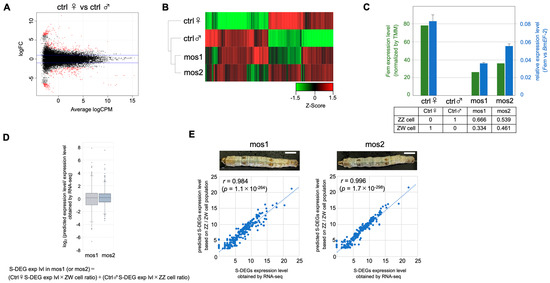 Analysis of the transcriptome in the fat bodies of gynandromorphic silkworms. (A) An MA−plot between control males and control females. The total of 242 sex−differentially expressed genes, i.e., genes with significant differential expression between males and females (FDR ≤ 0.05), are shown in red. (B) A heat map and hierarchical cluster of the sex−differentially expressed genes among the control males, control females, and gynandromorphic animals (mos1 and mos2). (C) The expression levels of Fem in each sample estimated by RNA−seq analysis are indicated by the green columns, and the relative expression level of Fem quantified by RT-qPCR is shown by the blue columns. The populations of ZZ and ZW cells in the fat bodies of the control males, control females, and gynandromorphic animals (mos1 and mos2) were calculated based on the expression level of Fem and are shown in the table. (D) The expression levels of each S−DEG in the gynandromorphic animals (mos1 or mos2) were predicted by the following formula: expression level of S−DEG in mos1 (or mos2) = (expression level of the S-DEG in control female × ratio of ZW cells) + (expression level of the S−DEG in control male × population of ZZ cells). The degrees of coincidence between the predicted expression levels and the levels of S−DEG expression determined by RNA−seq in the gynandromorphic animals (mos1 and mos2) were estimated by log2 (predicted expression level/expression level of S−DEG determined by RNA-seq). The estimated values and their distributions are represented by box−and−whisker plots. Dots show outliers. (E) A scatter plot of the predicted expression levels of S−DEGs and those determined by RNA−seq in mos1 and mos2. Scale bar: 10 mm. The vertical axis indicates the predicted expression levels and the horizontal axis indicates the expression level determined by RNA−seq. r, Pearson’s product–rate correlation coefficient; p−values are for the no−correlation test.