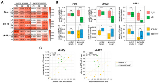 The expression levels of BmVg and JhSP-2 in different areas of the fat body and their correlations with Fem expression levels. (A) The expression levels of Fem, BmVg, and JhSP-2 in each area of three control females and three gynandromorphic individuals were quantified by RT−qPCR. Values are shown relative to the level of EF-2 expression. The expression level is also indicated by color according to the scale shown in the box to the right of each table. In the table, #1–#6 indicate individual larvae. (B) The expression levels of Fem, BmVg, and JhSP-2 were compared between the right and left areas of the fat bodies of control females and gynandromorphic larvae (upper panel). The same comparison was performed between the anterior and posterior parts of the fat bodies (lower panel). The values obtained from each sample and their distributions are represented by box−and−whisker plots. Error bars indicate the standard deviation. R and L indicate right and left, respectively. A and P, anterior and posterior, respectively. n.s., not significant. * p < 0.05, *** p < 0.01 (Mann–Whitney U test). (C) Scatter plots of the expression levels of Fem and BmVg (left panel) and Fem and JhSP-2 (right panel) in each area of the fat bodies described in (A). The vertical axis indicates the expression levels of BmVg or JhSP-2. The horizontal axis indicates the expression level of Fem. r, Pearson’s product–rate correlation coefficient; p−values are for the no−correlation test.