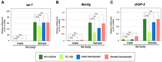 The effects of hemolymph on the sexually dimorphic expression of sp-1, BmVg, and JhSP-2. Male and female fat bodies were cultured for 1 h in hemolymph collected from male or female day 3 fifth instar larvae. The expression levels of (A) sp-1, (B) BmVg, and (C) JhSP-2 in the cultured fat bodies were quantified by RT-qPCR. w/o culture, without culture. TC-100 is a culture medium specifically for insect cells. The fat bodies were collected from four male or female larvae and split into four experimental groups (w/o culture, TC-100, male hemolymph, and female hemolymph). Values represent the means ± SE of quadruplicate qPCR reactions for each sample from one representative of three independent experiments. n.s., not significant, * p < 0.05, ** p < 0.03, *** p < 0.01 (Mann–Whitney U test).