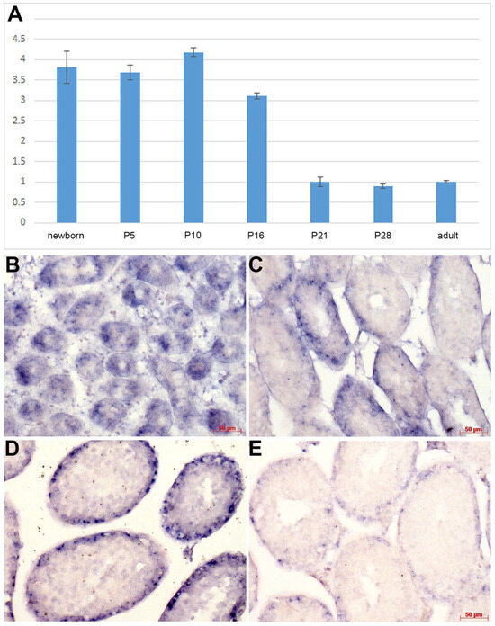 Although Taz deficiency in Drosophila as well as in both chimeric TazNEO and knockout TazKO mutant mice can cause male sterility [12,13,14], it remains unclear where and when TAZ is expressed in mammalian testes. To accurately recognize the effect of our point-mutant knockin (TazPM) and infer its function, we examined Taz mRNA expression levels and distribution in wt mice testes. qPCR analysis revealed Taz expression is present in testes at significant levels from newborn to postnatal (P) 16 stages, but is reduced in P21 to 4-month-old adults (Figure 1A). In situ hybridization confirmed localized robust Taz expression in P5 testes (when the spermatogonia first begin to differentiate), specifically within all the immature spermatogonia located in the wall of the seminiferous tubules (Figure 1B). At P16 and P21 (when the majority of the seminiferous tubules exhibit spermatocytes as the most advanced germ cell type but some tubules exhibit some round spermatids), restricted Taz expression continues robustly in testis tubules in basally located cells, many of which are spermatogonia, and some spermatocytes (Figure 1C,D). However, only weak Taz expression was observed in the basal layer of the P28 tubules (when elongating spermatids appear; Figure 1E) and in adult testes. Thus, Taz mRNA is present in both the immature postnatal and adult mice testes, with the highest level of expression occurring during the first wave of meiosis and spermatogenesis, continuing to be expressed at low levels in P28 and adult testes.