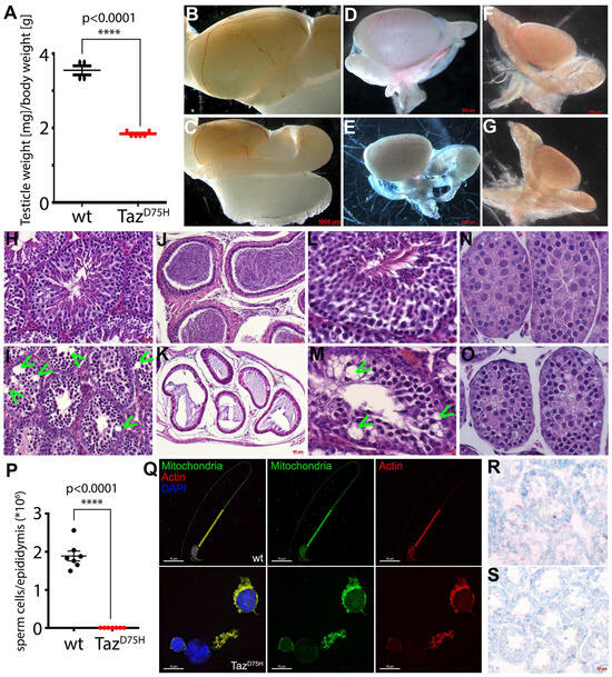 Characterization of TazPM testis phenotype. (A) Adult 4-month testis/body weight ratio in wt (black, n = 4) verses TazPM knockin (red, n = 6) mice. (B–G) Representative images of whole wt (B,D,F) and TazPM (C,E,G) 4-month (B,C), P17 (D,E) and P5 (F,G) littermate testes. (H–O) Hematoxylin and eosin staining of wt (H,J,L,N) and TazPM (I,K,M,O) testes (H,I) and epididymis (J,K) from 4-month-old mice, as well as P28 (L,M) and P17 (N,O) testis sections. (P,Q) Analysis of 4-month epidydimal wt and TazPM content numbers ((P), n = 7/genotype) and resultant staining of sperm head nuclei DNA chromatin (blue DAPI-positive), mitochondria-rich midpiece (green MitoTracker-positive) and tail (red actin-positive) within contents. (R,S) Oil red-O staining of lipid deposition in P28 wt (R) and TazPM (S) testes. Scale bars (B,C,E) = 1 mm; (D,F,G) = 500 μm; (H,I,K,R,S) = 20 μm; (J,K) = 50 μm; (L,M,N,O,Q) = 10 μm. Statistical significance set at **** p < 0.0001.