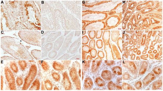 - Beumer, T.L.; Roepers-Gajadien, H.L.; Gademan, I.S.; van Buul, P.P.; Gil-Gomez, G.; Rutgers, D.H.; de Rooij, D.G. The role of the tumor suppressor p53 in spermatogenesis. Cell Death Differ. 1998, 5, 669–677. [Google Scholar] [CrossRef] [PubMed]