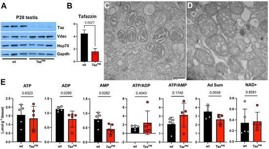 As we previously demonstrated, TazPM♂ cardiac ventricles, gastrocnemius skeletal muscles and livers express a mutant TazPM protein at equivalent levels to wt♂ [11]. We used Western blotting to measure Taz protein expression in testes. Significantly, P28 TazPM testes express the mutant TazPM protein at significantly lower levels (p = 0.0027) when compared with wt littermate testes (Figure 4A,B), suggesting that TazPM testis abnormalities may involve a different pathogenic phenotype compared to TazPM♂ striated muscles and livers. To assess whether decreased TazPM is due to there being fewer mitochondria, we measured voltage-dependent anion channels (Vdac) levels, as it is a major component of the outer mitochondrial membrane and a useful mitochondrial loading control [29]. As both Vdac (p = 0.249) and mitochondrial Hsp70 levels are not significantly altered, this indicates that TazPM♂ mitochondria are present at similar levels to wt (Figure 4A). As mitochondrial defects are predominant in BTHS, and TAZ itself impacts many aspects of mitochondrial structure function [4,6], we examined how the loss of TazPM♂ transacylase activity may affect mitochondrial morphogenesis and energy production, as ATP synthesis is one of the mitochondria’s primary functions [30], and oxidative phosphorylation (OxPhos) is required for male fertility [16,31]. Mitochondrial ultrastructure was examined via transmission electron microscopy, and all P28 TazPM testis mitochondria are structurally abnormal when compared to wt♂ littermates (Figure 4C,D). TazPM♂ mitochondria exhibit an enlarged honeycomb-like phenotype with a markedly lower number of cristae and a lack of contiguous intermembrane/intracristae spaces compared to wt♂ littermates that contain orthodox state cristae extending across the entire body of the organelle, affording an extensive surface area. However, despite these structural anomalies, TazPM testis ATP and NAD+ levels were unperturbed, and there is no decrease in ATP/ADP or ATP/AMP ratios (Figure 4E), suggesting that TazPM testes are not energetically adverse. Interestingly, ADP (p = 0.027) and AMP (p = 0.028) levels and the total adenine nucleotides (ATP + ADP + AMP, p = 0.05) are all significantly lower in TazPM than in wt littermate testes (Figure 4E), implying an accelerated nucleotide degradation [32] or a change in cell type [33] in abnormal TazPM testes.