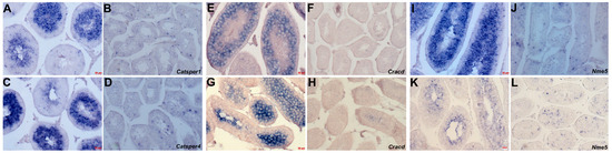 Following the weighing of the mice, testes were removed and weighed to obtain the ratio of testis weight to body weight using an ultrabalance (Adam Equipment, Columbia, MD, USA). Relative testis sizes were calculated from digital measurements using AxioVision 4.8 software (Zeiss, Oberkochen, Germany) taken using a StemiSVII AxioscopeAPO dissecting scope (Zeiss, Oberkochen, Germany) and seminiferous tubule sizes measured within histological serial sections. Mouse postnatal day (P) 5, 17, 21, 28 and testes and epididymis from 4-month-old mice (n = at least 4/genotype/age) were fixed in 4% paraformaldehyde overnight, dehydrated, embedded in paraffin, and sectioned at 5 and 10 μm. Serial sections (at least 4/slide) were either stained with hematoxylin and eosin or Oil red-O for histological analysis, and used for immunohistochemistry or in situ hybridization analysis of molecular biomarkers, as described [19,20]. Antibodies against Hook1 (1:400 Atlas Antibodies, Stockholm, Sweden) and Dazl (1:400 Abcam, Cambridge, UK) were used to assess spermatogenesis, and phospho-Histone H3 primary antibody (1:500, MilliporeSigma, Temecula, CA, USA) used to measure proliferation, and apoptosis was evaluated using the ApopTag In Situ Detection Kit (MillporeSigma, Temecula, CA, USA) according to the manufacturer. DAB/hydrogen peroxide was used to visualize immunosignals, and antibody diluent (Vectorstain, Newark, CA, USA), without primary antibodies, was used for negative controls. The mean ± SD number of cells labeled by pHH3 (proliferation index) or TUNEL (apoptotic index) were determined per 1000 cells counted in 6 separate fields in 5 mm testis sections (n = 4 separate testis/stage/genotype. Sense and anti-sense non-radioactive Catsper1 (MGI:2179947), Catsper4 (MGI:3043288), Nme5 (MGI:1922783) and Cracd (MGI:2444817) cDNA probes were transcribed for hybridization. Two partially overlapping Taz (MGI:109626) cDNAs probes were generated from 218 to 801 bp (583 bp) and from 789 to 1354 bp (565 bp) regions, and both antisense probes produced similar expression patterns in consecutive 10 μm serial sections. Sense probes were negative.