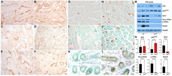 For Western blot analysis, P28 testes were isolated from TazPM♂ and wt♂ mice (n = 6/genotype) were homogenized in RIPA protein lysis buffer (Sigma-Aldrich, St. Louis, MO, USA) and resultant protein concentrations normalized as described [11,23]. Following blocking in Blotting-Grade Blocker (Bio-Rad, Hercules, CA, USA), blots were probed with the following antibodies: p53 phospho-S392 #33889, Hsp70 #5439, gamma H2AX #81299, Nme5 #231631, Sirt1 #12193 (Abcam, Cambridge, UK), total p53 #sc-71820, Taz #sc-365810 (Santa Cruz, Dallas, TX, USA), GAPDH #G8795 (Sigma-Aldrich, St. Louis, MO, USA), and Vdac #PA1-954A (ThermoFisher, Waltham, MA, USA). Immunoreactive protein band signals were detected and verified as described [11,23]. X-ray films of varying exposures were scanned for each antibody, and densitometric signal intensity was quantified (n = 6 of each genotype/antibody). Statistical analysis was performed via Prism software version 5.02 (GraphPad Software, San Diego, CA, USA).