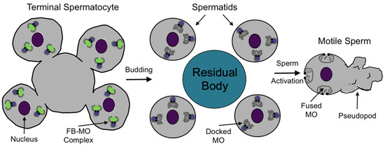 Key events of spermatogenesis and sperm activation. The terminal spermatocyte contains budding spermatids surrounding a developing residual body (RB) [16,21,22,23]. Spermatids contain lysosome-like fibrous body–membranous organelles (FB-MOs) [16,21,22,23]. In the FB-MO complex, the FB (fibrous body) is colored green, and the MO is colored blue. MOs are Golgi-derived and associate with FBs to form the FB-MO complex [16,21,22,23]. During spermatid differentiation, round spermatids bud from the terminal spermatocyte in an asymmetric division [16,21,22,23]. Spermatids selectively retain the FB-MOs and cellular components that are no longer needed are shed to the residual body [16,21,22,23]. The MO membrane also retracts and docks with the plasma membrane, and the FB is released and disassembled [16,21,22,23]. During sperm activation (spermiogenesis), the round spermatids extend a pseudopod and become motile, and the MO fuses with the plasma membrane and releases its contents [16,21,22,23]. The purple oval represents the nucleus in all stages.