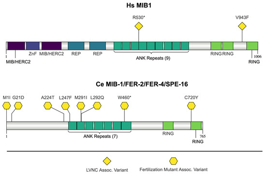 Protein diagram of C. elegans MIB-1/FER-2/FER-4/SPE-16 and H. sapiens MIB1. Diagram depicting full-length protein with protein domains and genetic variants. Human and C. elegans genetic variants are labeled with the shapes indicated at the bottom of the figure (asterisk (*) indicates a nonsense mutation). Schematic diagram was generated using Illustrator for Biological Sequences (IBS) 2.0 [49].