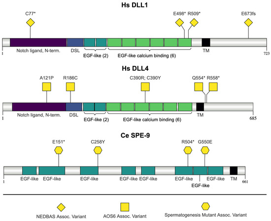 Protein diagram of C. elegans SPE-9 and H. sapiens DLL1 and DLL4. Diagram depicting full-length protein with protein domains and genetic variants. Human and C. elegans genetic variants are labeled with the shapes indicated at the bottom of the figure (asterisk (*) indicates a nonsense mutation). Schematic diagram was generated using Illustrator for Biological Sequences (IBS) 2.0 [49].