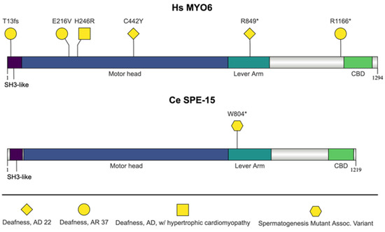 Protein diagram of C. elegans SPE-15 and H. sapiens MYO6. Diagram depicting full-length protein with protein domains and genetic variants. Human and C. elegans genetic variants are labeled with the shapes indicated at the bottom of the figure (asterisk (*) indicates a nonsense mutation). In MYO6, the T14fs, E216V, and R1166* mutations are associated with autosomal recessive (AR) deafness, the C442Y and R849 mutations are associated with autosomal dominant deafness (AD), and the H246R mutation is associated with AD deafness with hypertrophic cardiomyopathy. Schematic diagram was generated using Illustrator for Biological Sequences (IBS) 2.0 [49].