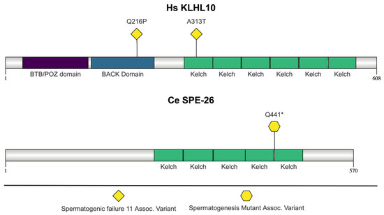 Protein diagram of C. elegans SPE-26 and H. sapiens KLHL10. Diagram depicting full-length protein with protein domains and genetic variants. Human and C. elegans genetic variants are labeled with the shapes indicated at the bottom of the figure (asterisk (*) indicates a nonsense mutation). Schematic diagram was generated using Illustrator for Biological Sequences (IBS) 2.0 [49].