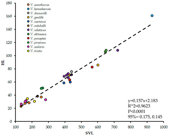Body size allometry of snout-vent length (SVL) plotted against Head Length (HL) in millimeters for Varanus specimens where both forms of data were available. Regression information is depicted on the graph.