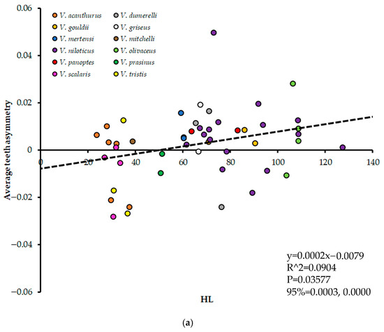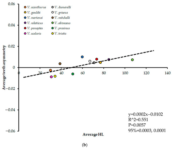 Body size in Head Length (HL) plotted against average teeth asymmetry for all Varanus species except V. komodoensis. (a) represents each lizard specimen as a single data point, and (b) represents values for all lizards of each species averaged together. Regression information is depicted on each graph.