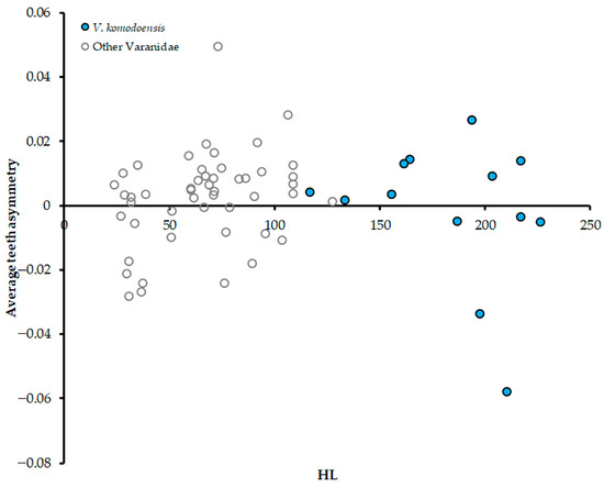 Body size in Head Length (HL) plotted against average teeth asymmetry all V. komodoensis specimens compared to remaining varanids. No significant regression was yielded for either V. komodoensis alone or all varanids together (p > 0.05).