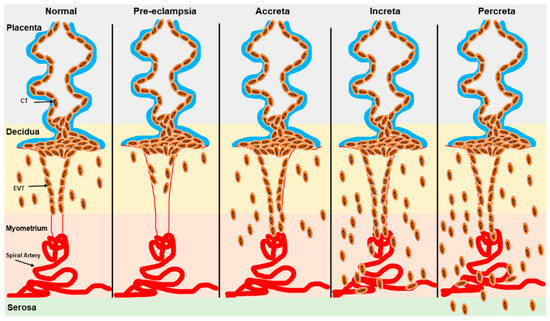 Schematic representation of trophoblast invasion in normal and pathogenic states. Trophoblast invasion for spiral artery remodeling is severely restricted in the decidua in PE while excessive trophoblast invasion in the myometrium and serosa is observed in placenta accreta, placenta increta, and placenta percreta. EVT: Extravillous trophoblast; CT: cytotrophoblast.