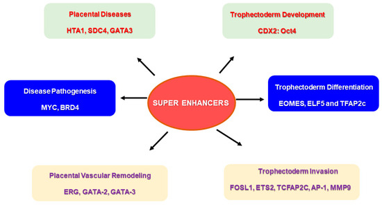 Super enhancers (SEs) and their putative role in placental physiology. Specific super enhancer-driven networks may have a significant role to play in events required for successful placentation. SE-driven networks can be associated with trophoblast development and differentiation, and trophoblast invasion of spiral arteries, which are important for vascular remodeling during pregnancy. Several SE-driven events may also be responsible for disease pathogenesis, specifically in placental diseases.