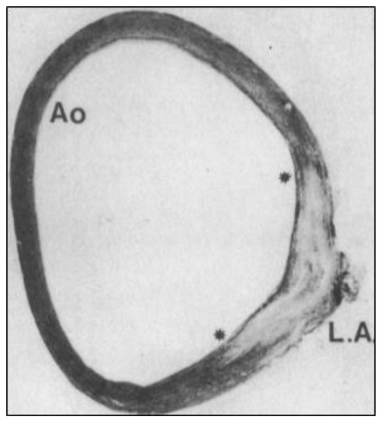 “Fish-tail-like” insertion junction (between the asterisks) of human ductus arteriosus SMCs (LA) into the AO media (reprinted with permission from [19]). Note the absence of organized elastic fibers in the ductal insertion. LA—ligamentum arteriosum.
