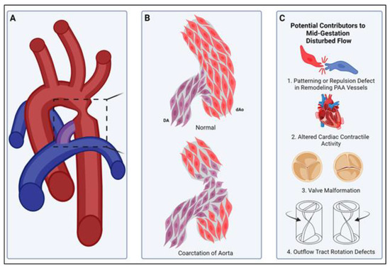 A smooth muscle compartment boundary model of CoA. (A) Illustration of a common site of aortic coarctation where the ductus arteriosus (purple) joins the descending thoracic aorta (red). Boxed area is illustrated in more detail in panel (B). (B, top) Normally, cardiac neural-crest-derived DA-SMCs (DA, purple) and paraxial-mesoderm-derived descending Ao-SMCs (dAo, red) fail to mix, and a compartment boundary is formed at their interface (see insertion junction, Figure 3). (B, bottom) In coarctation of the aorta, loss of the compartment boundary results in DA-SMCs (DA, purple) invading the aortic media (dAo, red), producing an aortic constriction upon birth of the neonate. (C) Potential mechanisms for the pathogenesis of CoA. The normal DA-SMC interface with Ao-SMCs is established during SMC investment of pharyngeal arch artery (PAA) walls in mid-gestation (see, Figure 2). The remodeling of the paired PAAs is highly sensitive to changes in blood flow rate and flow distribution through the right and left sides of the PAAs [10,15,104,105]. Either disruptions in SMC cell–cell interactions that normally prevent mixing across SMC-origin-dependent compartment boundaries (C1) or defects in cardiac contractile activity (C2), valve morphogenesis (C3), or outflow tract formation/rotation (C4) can alter the hemodynamic shear stress distribution during PAA remodeling. We propose that the formation of the normal DA-Ao SMC interface (B) is also a flow-sensitive process during PAA remodeling, and disturbed patterns of SMC investment during PAA remodeling can produce CoA observed in neonates.