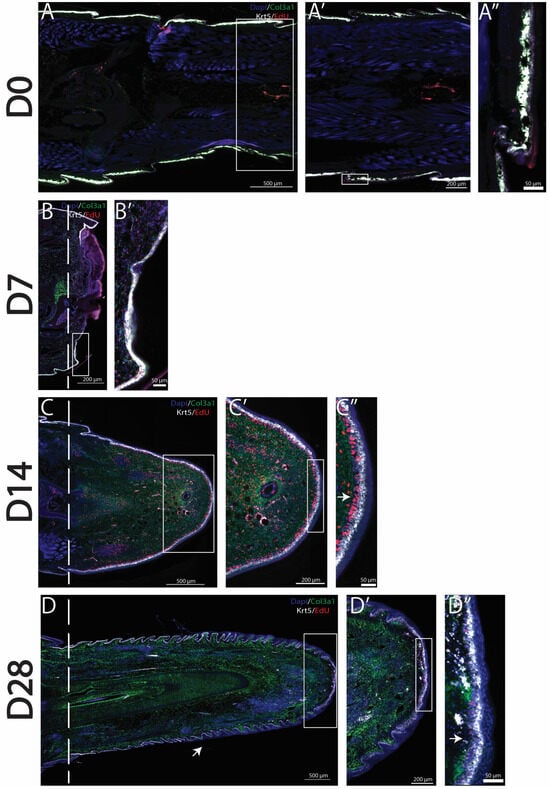 As previously stated, amputated lizard tails undergo a series of stages in which dead tissues are removed, blastemas are formed, and tail regeneration occurs. Previously described col3a1+ fibroblast populations have been shown to expand to form a majority of the blastema, while krt5+ epidermal cell populations form the WE [7]. Using HCR FISH as well as EdU staining, we labeled and tracked the proliferation of blastema fibroblasts and WE cells over time. In original (D0) tails, col3a1+ fibroblasts are closely associated with the krt5+ epidermal cell population directly under scales, with little proliferation observed in either population [Figure 1A–A″]. During the histolysis phase (D7), col3a1+ fibroblasts remained closely associated with krt5+ epidermal cells. EdU+ proliferating cells belonging to both col3a1+ and krt5+ populations were observed in close proximities of amputation planes [Figure 1B,B′]. By the blastema stage (D14), a massive expansion of col3a1+/EdU+ fibroblasts, as well as the establishment of a robust krt5+ population, was observed. The WE appears thick, with the inclusion of a proliferative zone directly between a strongly expressing krt5+ epidermal cell population and col3a1+ fibroblasts [Figure 1C–C″]. At full regeneration (D28), varied stages of skin neogenesis were observed, with the highest-expressing krt5+ epidermal cells localizing closest to planes of amputation. Epidermal cells remained closely associated with fibroblast clusters that highly expressed col3a1. Overall, fibroblast and epidermal populations decreased in proliferation with reductions in the EdU signal throughout regenerated tails. However, EdU+ proliferating zones were observed at distal tips of regrown tails [Figure 1D–D″].