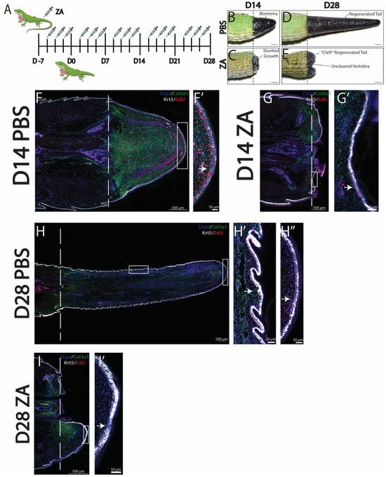 Lizards were treated with 5-Ethynyl-2′-deoxyuridine (EdU) (100 µg drug/g animal) via intraperitoneal injection 4 h before tail sample collection. Collected tails were immediately processed for histology, and Click-iT EdU Imaging kits (C01337, Invitrogen) were used to detect EdU+ cells according to the manufacturer’s instructions. Briefly, 1 mL of 3.7% formaldehyde in PBS was added to each slide and incubated for 15 min at room temperature. Formaldehyde was then removed, and slides were washed twice with 1 mL of 3% BSA in PBS. Wash solution was discarded, and 1 mL of 0.5% Triton® X-100 in PBS was added to each slide. Samples were incubated for 20 min at room temperature and washed twice with 3% BSA in PBS. To detect EdU, a Click-iT reaction cocktail using AlexaFluor488 azide (Thermo, Waltham, MA, USA) was prepared. Permeabilization buffer was removed from sections, and samples were washed twice with 1 mL of 3% BSA in PBS. Wash solution was discarded, and 0.5 mL of the Click-iT reaction cocktail was added to each slide. Samples were then incubated for 30 min at room temperature, protected from light. Afterward, the reaction cocktail was removed, and each sample was washed once with 1 mL of 3% BSA in PBS.