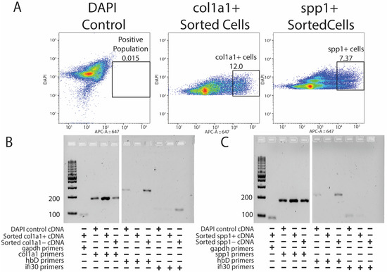 Probe sequencing allows for the enrichment of pure fibroblast populations without erythrocyte and immune cell contamination. (A) DAPI control (left), HCR-sorted col1a1+ (middle), and HCR-sorted spp1+ (right) FACS results indicating the percentage of positive cells collected. (B) PCR results showing the presence of col1a1+ gene expression amplified from HCR-sorted col1a1+ cells without hbD and ifi30 expression. (C) PCR results showing the presence of spp1+ gene expression from spp1+ HCR-sorted populations without hbD and ifi30 expression.