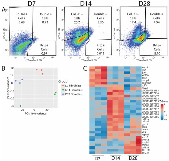 Probe sequencing of fibroblast populations over time in regenerating lizard tails exhibit transitions from immune response to matrix establishment. (A) D7 (left), D14 (middle), and D28 (right) FACS results indicating the percentage of col3a1+ fibroblasts, krt5+ epidermal cells, or double-positive cells collected for bulk RNA-seq analysis. (B) PCA plot of D7, D14, and D28 populations from bulk RNA-seq analysis. (C) Heatmap of top differentially expressed genes for D7, D14, and D28. D7 shows an upregulation of immune response genes. D14 shows an upregulation of proliferative pathways. D28 shows an increase in matrix building- and chondrogenic-associated genes.