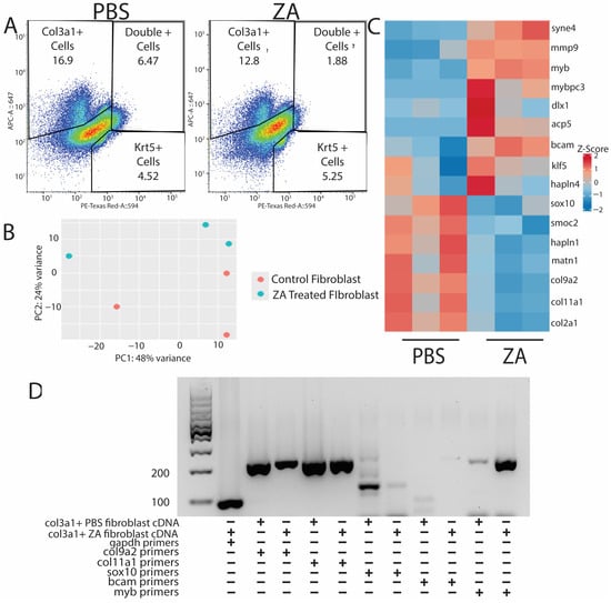 Probe sequencing of fibroblast populations from osteoclast-inhibited tails exhibits downregulation of ECM-associated genes and stimulation of genes associated with fibrotic scaring. (A) PBS (left) and ZA (right) col3a1+ and krt5+ cell populations collected via FACS from D21 tails. (B) PCA plot of PBS- and ZA-treated fibroblast populations from bulk RNA-seq analysis. (C) Heatmap of top differentially expressed genes from HCR-sorted col3a1+ fibroblasts collected from lizards treated with PBS or zoledronic acid. Matrix-associated genes are highly dysregulated under osteoclast inhibition, while fibrotic scar markers are upregulated. (D) PCR showing expression of col9a2, col11a1, sox10, bcam, and myb in col3a1+ fibroblasts collected at D21 from PBS- and ZA-treated lizards.