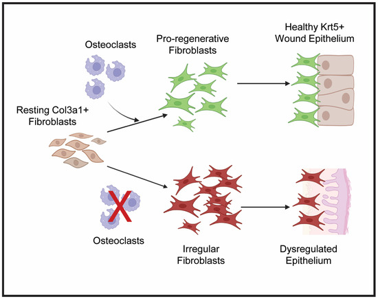 Proposed hypothesis for osteoclast-regulated crosstalk between lizard tail blastema fibroblasts and WE. Under normal conditions, osteoclast activity stimulates resting col3a1+ fibroblasts to proliferate and expand to form the blastema. These pro-regenerative fibroblasts communicate with krt5+ epidermal cells to form healthy, thick WE. When osteoclast activity is inhibited, symbolized by the red X, fibroblasts become irregular and fail to proliferate and establish pro-regenerative ECM. Failed fibroblast expansion and matrix establishment leads to stimulation of fibrotic genes and reduced proliferative capabilities of dysregulated WE. Created by Bio Render version 201.