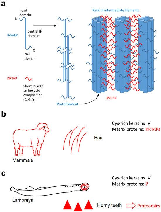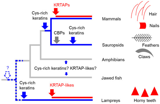 - Sachslehner, A.P.; Eckhart, L. Convergent evolution of cysteine-rich keratins in horny teeth of jawless vertebrates and in cornified skin appendages of amniotes. Mol. Biol. Evol. 2025, 42, msaf028. [Google Scholar] [CrossRef] [PubMed]