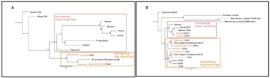 The Actinopterygii clade of gastrin sequences displayed minimal differences in substitution per site between the gastric three-spined stickleback (0.48) and agastric Japanese rice fish (0.34) (Figure 3A). Branches leading to monotreme and therian mammal CCKBR clades displayed identical lengths (0.17 substitutions per site) but differed more in post-divergence in the mouse and wombat (0.41 and 0.25 substitutions per site) when compared to the agastric platypus and echidna (0.07 and 2 × 10−6 substitutions per site). Actinopterygii CCKBRA sequences had similar substitutions per site within the clade of the pufferfish (0.15), the Japanese rice fish (0.15) and the three-spined stickleback (0.12). The pufferfish CCKBRB sequence contained a larger number of substitutions per site (0.2) when compared to three-spined stickleback (0.07) and Japanese rice fish (0.13) (Figure 3B).