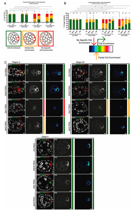 Our initial observations indicate that both Set1 and Ash2 are required for oocyte determination. The oo18 RNA-binding protein gene (orb) encodes an RNA-binding protein essential for egg chamber formation and polarity establishment during oogenesis [34]. Orb is initially expressed throughout the 16-cell germline cyst, but it soon begins to progressively accumulate in the two pro-oocytes, and subsequently becomes restricted to a single cell, the future oocyte. As a result of the asymmetric accumulation of oocyte determinants within the germline cyst, one cell adopts the oocyte fate, while the remaining 15 differentiate as supporting nurse cells. As such, to assess oocyte fate determination, we evaluated Orb enrichment using two distinct experimental approaches: first, we used an epifluorescence microscope to score egg chambers in three distinct classes (Figure 1A); second, we analyzed representative confocal images using a ‘rainbow’ LUT to highlight Orb staining pixel intensity and objectively score egg chambers in three distinct classes (Figure 1B) (for more information see Materials and Methods (Section 2)).