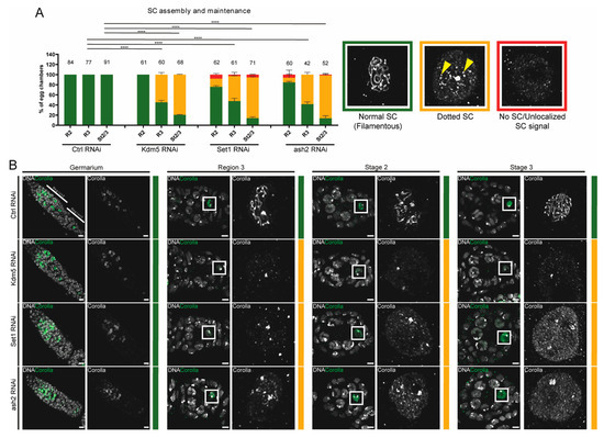 Since maintenance of SC assembly during mid-pachytene occurs exclusively in the presumptive oocyte, we investigated whether this maintenance was impaired following Set1 and Ash2 depletion. To test this, we stained control, Set1-depleted and Ash2-depleted ovaries for the SC subunit Corolla. As a positive control for SC maintenance defects, we used Drosophila ovaries depleted for Lysine demethylase 5 (Kdm5) [32]. As expected, Kdm5 depletion resulted in a significant loss of SC integrity by mid-pachytene, visible as a fragmented SC (dotted SC) (Figure 2A,B). Depletion of Set1 and Ash2 also impaired maintenance of SC integrity during mid-pachytene (Figure 2A,B). Notably, the disassembly of the SC following Set1 and Ash2 depletion, but not following Kdm5 depletion, was associated with an apparent accumulation of the SC subunit Corolla in the oocyte nucleoplasm (Figure 2B).