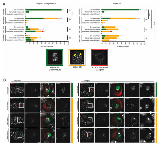 Control egg chambers (mCherry RNAi) invariably showed a normal SC (filamentous) during pachytene of prophase I (Figure 3A,B), even when there was only a partial enrichment of Orb in the oocyte (Figure 3A). As expected [32], depletion of Kdm5 (Kdm5 RNAi) was associated with a loss of the SC integrity (dotted SC) during mid/late-pachytene (stages 2/3) independently of oocyte determination defects (Orb oocyte-enrichment) (Figure 3A,B). Depletion of Set1 and Ash2 was associated with loss of SC integrity during mid and mid/late-pachytene (region 3 and stages 2/3). However, the increased frequency of egg chambers with normal Orb enrichment during mid/late pachytene (stage 2/3) did not correlate with any detectable recovery of SC assembly defects (Figure 3A,B).