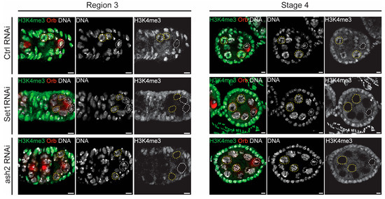 H3K4 trimethylation (H3K4me3) is a histone modification typically associated with active gene transcription and is enriched at gene promoters. H3K4me3 levels were significantly higher in the transcriptionally active nurse cells compared to the oocyte (see control RNAi in Figure 4). Drosophila Set1 is the major H3K4me3 methyltransferase, catalyzing the bulk of H3K4 di- and tri-methylation in the female germline [24,29]. Consistently, the levels of H3K4me3 were significantly reduced in the germline following Set1 and Ash2 depletion (Figure 4).