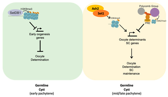 The structure and organization of the female germline cyst varies among metazoans, most likely to accommodate distinct developmental strategies of the oocyte. However, many of the epigenetic mechanisms supporting female gametogenesis are remarkably conserved [4,5,6,7,8,9]. For example, in mammals and Drosophila, oocyte determination during early prophase I occurs in the context of a transient weakening of Polycomb-mediated repression of early meiotic genes [10,11]. In contrast, oocyte differentiation during mid/late-prophase I and the establishment of the ovarian reserve depend on Polycomb-dependent repression of early prophase I genes [10,11,12,13]. Impairment of such Polycomb-mediated transcriptional repression is associated with meiotic defects, abnormal development and decreased viability of primary oocytes, and premature ovarian failure [11,12,13].