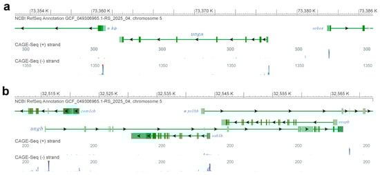 Cap analysis of gene expression (CAGE-Seq) datasets were visualized using the inbuilt Genome Data Viewer (GDV) of the GRCz12tu dataset hosted on the National Center for Biotechnology Information (NCBI) website of the National Institute of Health (NIH): https://www.ncbi.nlm.nih.gov/datasets/genome/GCF_049306965.1/. Datasets are available through the GDV interface and can be accessed directly: for unga (https://short-link.me/18q2l) and for ungb (https://short-link.me/18q31) (links accessed on 25 August 2025).