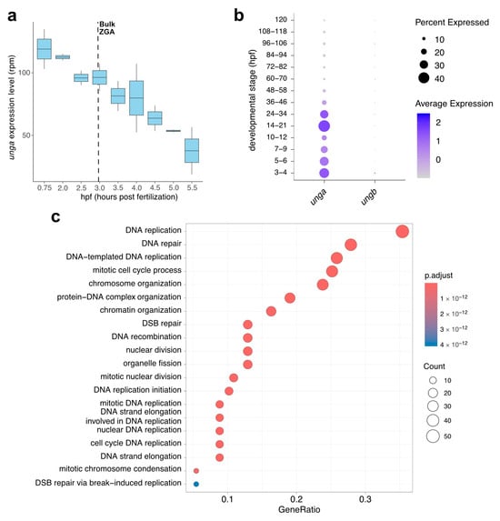 In silico analysis of the developmental expression of zebrafish UNG paralogs. (a) Expression dynamics of unga during the earliest stages of development show a gradual decrease in maternal transcript with no significant zygotic contribution after ZGA (Data from [46]). (b) The analysis of single-cell datasets also demonstrates the gradual clearance of maternal products, following a burst of unga expression during later stages of somatogenesis. During the same timeframe, ungb expression cannot be observed (Data from [48]). (c) GO analysis of genes that show significant co-expression with unga during early embryogenesis shows that the highest level of unga expression can be observed in actively dividing cell populations.