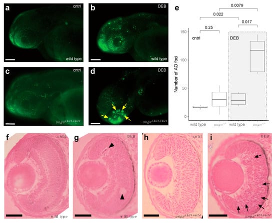 We performed a classical histological analysis on the retinas of 2 dpf control and DEB-treated, wild-type and ungaelu24/elu24 embryos, using HE staining. This revealed that in wild-type retinas, indeed, some dead or dying cells could be seen after the application of the genotoxic agent (Figure 4f,g), but in the mutant retinas, an abundance of shrinking cells (with apoptotic character) was apparent after DEB treatment. It is noteworthy that at this stage, retinal precursors are one of the fastest dividing cell populations within the developing embryo, which provides an important context to these observations.