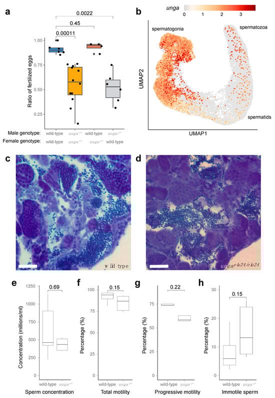 Homozygous unga mutant zebrafish males are subfertile. (a) Ratio of fertilized eggs in the indicated crosses. (b) Expression of unga in the differentiating germ cells of adult zebrafish. ScRNAseq data used in this reanalysis were derived from [52]. (c,d) Toluidine blue staining of testis sections from wild-type (c) and mutant (d) testes. Scale bar: 50 μm. (e–h) Comparative statistics of various sperm concentration (e) and motility (f–h) parameters between wild-type and unga mutant males (The Mann–Whitney test was used to calculate the p-values).